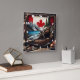 A beaver poses on a log beside a river, with a Canadian flag backdrop featuring mountains and pine trees, symbolising Canada’s natural beauty.