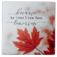 Inspirational ceramic tile depicts a simple fall nature photograph with a red leaf. It features the encouraging beloved Christian worship hymn, "Because He lives I can face tomorrow." Autumn image by Cole Keister, Unsplash.