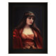 This is a Portrait Of A Bedouin Young Girl wearing what appears to be a large piece of head jewellery made of gold with some inlaid gems, wearing a red dress as well as a red velour cloak with gold embossed accents draped over her shoulders.