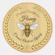 Wreath or garland of leaves surrounding a honey bee drawing over golden stripes in an amber gold border. Edit customised script lettering for the type of honey, beeswax, candles and other products from your bees, with round text for product features, beekeeper or professional apiary name, and net weight.