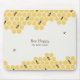 A mouse pad with a pattern of a bee on honeycombs on top and bottom and customisable grey and brown texts: perfect to make a gift to a beekeeper, a bee lover, a friend who loves nature, or just for your own family!