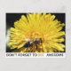 Inspirational postcard featuring an original macro photograph of a honeybee gathering pollen from a yellow dandelion flower on a sunny spring day. The motivational quote, in black and yellow font, reads "Don't forget to bee awesome".