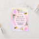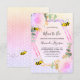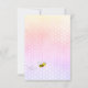 A fun summer baby shower invitation celebrating a baby girl. A rainbow coloured background in pink, purple and golden with a honeycomb pattern. A geometric frame. Decorated with flowers and eucalyptus greenery and happy bumble bees. With the text: Mum to Bee and the name of the mother to bee on front written with a modern hand lettered style script. Black letters.