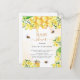 A stylish white and golden watercolored background. Decorated with bumble bees, melting honey and honeycomb with yellow florals, flowers and a honey jar. With the text: Baby Shower written with a modern hand lettered style script. Personalise and add the name of the mum to bee. Golden and black letters. Gender neutral.