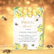 A stylish white and golden watercolored background. Decorated with bumble bees, melting honey and honeycomb with yellow florals, flowers and a honey jar. With the text: Bridal Shower written with a modern hand lettered style script. Personalise and add the name of the bride to bee. Golden and black letters.