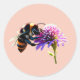 A vibrant bee hovers delicately over a blooming purple flower. The bee's striped body contrasts with the soft petals, highlighting the beauty of pollination.