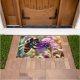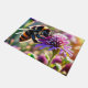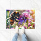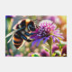 A vibrant bee hovers delicately over a blooming purple flower. The bee's striped body contrasts with the soft petals, highlighting the beauty of pollination.