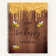 Bee happy brown wood gold glitter drips name notebook
