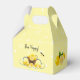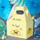 This adorable favour box design has a yellow and white background pattern. On the front and back panels there's a brown wicker basket full of lemons. The text reads "Bee Happy!", with a little bee. The side panels feature two whole lemons and one half of a lemon. All text can be customised.