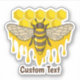 Honey bee with open wings icon over bee hive and honey drops. Custom text.