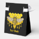 Honey bee with open wings icon over bee hive and honey drops. Custom background colour. Custom text on both sides.