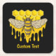 Honey bee with open wings icon over bee hive and honey drops. Custom background colour. Custom text.
