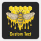 Honey bee with open wings icon over bee hive and honey drops. Custom background colour. Custom text.