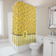 This sweet bee pattern shower curtain shows honeybees over a light, bright golden-yellow honeycomb background. The yellow and black bees have gossamer white-blue wings. They're crawling over the honeycomb inside their beehive. The bottom is edged in a golden and off-white stripe pattern that includes a honeycomb shape and room for your personalised monogram letter. This nature - inspired shower curtain is perfect for a pretty, country home decor theme.