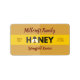 A bee got into the honey! - in place of the second letter O in the word - within a tangerine orange band across a horizontal honey jar label personalised with the name of the family beekeeper or professional apiary, and contact information over two shades of dark amber.