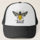 This hat design features an ornate bee on the front with the work "kind" written below in a script font. The bee design is black and yellow on a bright white backdround.