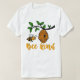 This white t-shirt features a charming illustration of a cartoon bee flying towards a traditional straw skep beehive hanging from a branch with green leaves. Below the illustration, the words "Bee kind" are written in a warm orange script. The design promotes a message of kindness and nature appreciation.