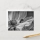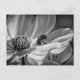 A black and white photograph on a postcard of a bee on a Cosmo flower.