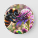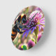 A vibrant bee hovers delicately over a blooming purple flower. The bee's striped body contrasts with the soft petals, highlighting the beauty of pollination.