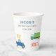 Transport theme paper cup featuring a Blue truck, garbage truck, school bus and a fire truck.
