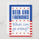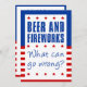 Beer and Fireworks - What Can Go Wrong funny invitation for a July 4th party. A hilarious invite for an Independence Day party featuring alcohol and fireworks! Red white and blue colours.