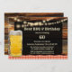 A festive birthday party invitation for beer lovers with a BBQ gingham image and beer glass on rustic wood with string lights.