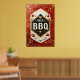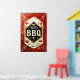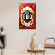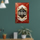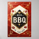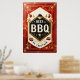 An illustration of a stylised BBQ grill with the words Beer & BBQ Go Together. The design features a red and gold colour scheme with decorative accents.