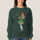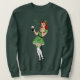 A cheerful vintage pin up girl holding a classic Irish stout while blowing lucky shamrocks into the air. A playful design inspired by retro beer poster art.
