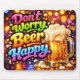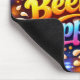 A frothy mug of beer sits beside vibrant rainbow-colored text, illuminated by bright bokeh lights that create the perfect party atmosphere