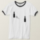 two black beer bottles, and a white ping pong ball with a black outline. Motion blur behind the ball to indicate movement. One beer bottle is higher than the other. Inspired by a classic video game, and a popular drinking game.