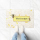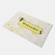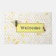 Welcoming door mat features golden honeycomb background, tinted vintage bee illustrations and centre customisable text box.