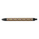 This cute pattern features a graphic motif of busy bees in black and yellow set against a stylised honeycomb design in warm orange and brown hues.