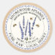 A round or square label with a faux 'textured" kraft border - looks great on a matte option sticker. Lifelike honeybees and lavender surrounded by your apiary name, location and honey description (raw, hand-bottled, single source, etc).
