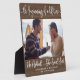Rustic engagement photo keepsake. Design features single photo of the couple, typography script ''the beginning of a lifetime'' and ''he asked..she said yes!'' , names and engagement date on a wooden background. Perfect as a engagement party gift or a keepsake.