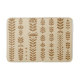 This is a nature-inspired bath mat with a rustic motif featuring vertical botanical columns. The design is perfect for cosy, curated interiors. The background is beige and the motifs are earthy brown. They are a repeating pattern of vertical columns of stylised plant motifs like leaves, flowers, circles, and semi-circles.