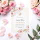 A white arch frame and soft beige, cream coloured background. Decorated with pink flowers and beige bows. Personalise and add a name, age and details.