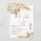 Bohemian floral themed birthday invitation featuring two natural tones beige and brown floral arrangements with pampas grass, and a champagne glass. This bohemian themed 40th birthday invitation is fully editable and can be used for any age or occasion.