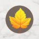 Beautiful horn of plenty with pumpkin, fruits and autumn leaves on light beige and brown Table Confetti.