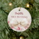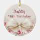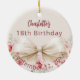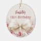 A beige, cream coloured background. Decorated with a large bow and pink flowers. Personalise and add a name, age and birthday date.