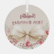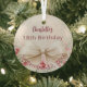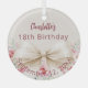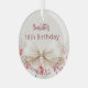 A beige, cream coloured background. Decorated with a large bow and pink flowers. Personalise and add a name, age and birthday date.