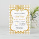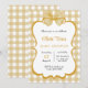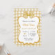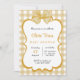 This baby shower invitation features a beige and white chequered background with a large beige bow at the top. The centre area is surrounded by a gold bow, perfect for adding personal text. The design is charming and elegant, perfect for celebrating a new baby.