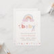 These adorable baby shower invitations feature trendy boho style and trendy handwritten script. A terracotta and neutral cute painted rainbow is decorated with orange and peach watercolor flowers on a simple white background.