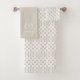 Beige and white trellis patterned bath towel set personalised with your family monogram or other text in a rustic laurel branch. Use the design tools to choose any background colours, edit the text fonts and colours or upload your own photos to create a one of a kind design. The perfect touch for your modern farmhouse bathroom decor!