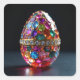 A jeweled Easter egg intricately decorated with a mosaic of colorful, faceted gemstones in shades of pink, purple, blue, green, orange, and red. A band of clear, sparkling diamonds encircles the middle of the egg, set in gold.