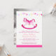 Pretty hand-painted pink rocking horse with stars and graphic bunting, boy belated baby shower invitations. Ideal if missed your baby shower due to unforeseen circumstances, includes a quick meet up with the new baby if required. Other matching items are available. Original whimsical baby pink hobby / rocking horse watercolor painting and graphic design by Sarah Trett for www.mylittleeden.com on Zazzle.