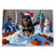 A heartwarming holiday illustration featuring a cheerful dog playing in the snow, wearing a Santa hat and surrounded by colourful gift boxes. In the background, children build a snowman beside a snow-covered Christmas tree, creating a joyful winter wonderland. Perfect for spreading holiday cheer and capturing the magic of Christmas.