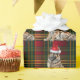 An adorable watercolor illustration of a Belgian Tervuren dog, pairs with a red, gold and green seasonal plaid patterned background, and the dog wears a festive holiday hat.