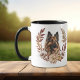 A pretty autumn wreath in tones of cinnamon brown, tan, and cream surround the watercolor image of a beautiful Belgian Tervuren Dog. The image is printed twice on the mug, with your custom text between them.