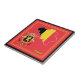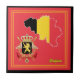 The national flag of Belgium is infused into an outline map of the country. The country`s coat of arms is also included and both are on a background of red with yellow frames to complete the design.