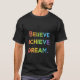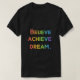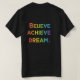 This inspiring t-shirt design features the phrase "Believe Achieve Dream" in bold, multicolored letters against a dynamic, abstract background. The design conveys a message of hope, determination, and the power of dreams to shape one's future. It encourages wearers to believe in themselves, set ambitious goals, and work hard to achieve their aspirations.